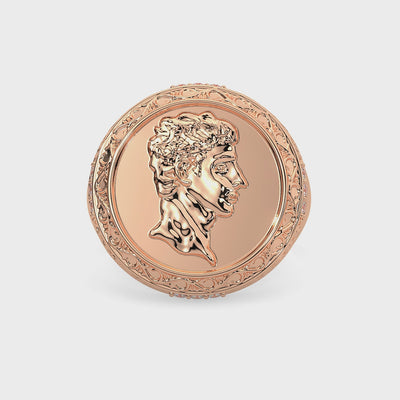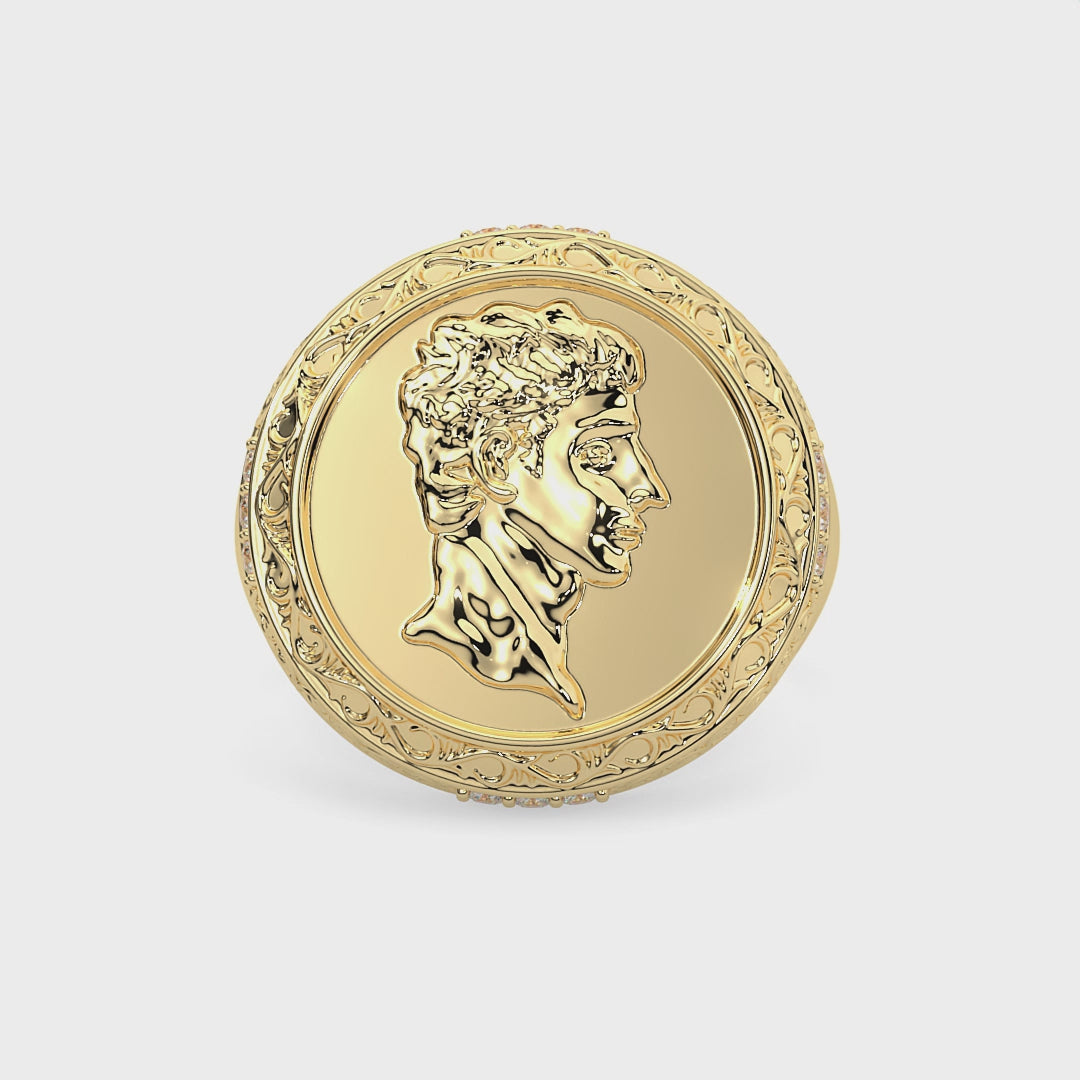 The “Imperium” Ring is empire forged into metal — a bold 30g statement cast in solid 14K gold and hand-set with 2 carats of brilliant white diamonds. A sculpted Caesar profile dominates the face, wrapped in an ornate border of vintage filigree and icy precision. This isn’t just a ring — it’s a seal of command, crafted for those who build legacies, not just wear them.